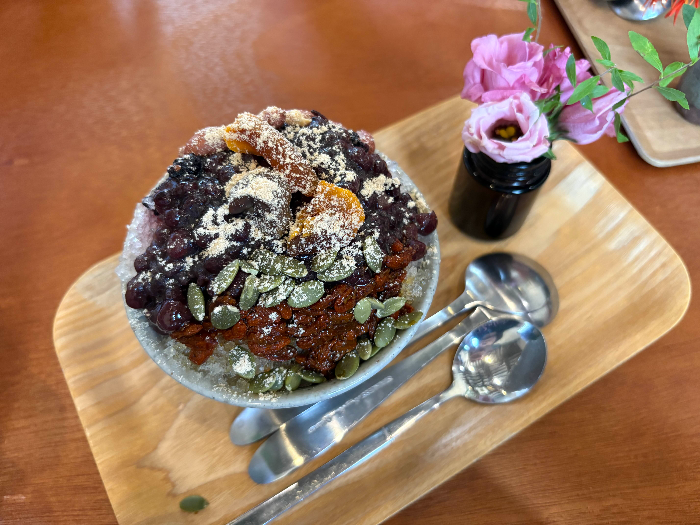 음료와 빙수 외에도 토스트, 정과, 찰떡 같은 전통 주전부리가 함께 판매되고 있어, 차 한 잔과 달콤하고 건강한 간식을 함께 즐기기에 딱 좋았어요.
