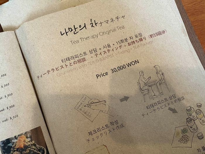 재밌었던 메뉴는 ‘티 테라피스트 상담’을 통해 나만의 차를 만들어볼 수 있다는 점이었어요. 요즘 컨디션이나 기분에 맞춰 체크리스트를 작성하면, 어울리는 차를 추천해주고 직접 블렌딩까지 해주는데 이 과정이 꽤 특별하고 재미있어보이더라고요.