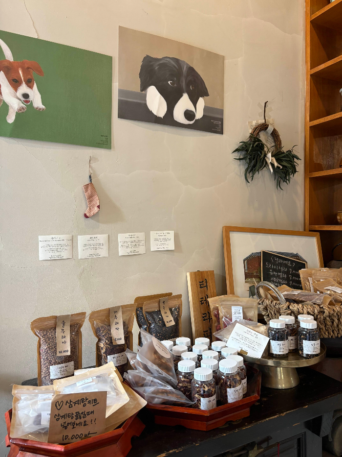 ‘티 테라피’라는 카페 이름답게 다양한 전통차와 건강차, 건강식품이 판매되고 있었고, 그중에서도 삼계탕 키트가 유독 눈길을 끌었어요. 삼계탕 끓일 때 같이 넣고 끓이면 되나 봅니다…?
