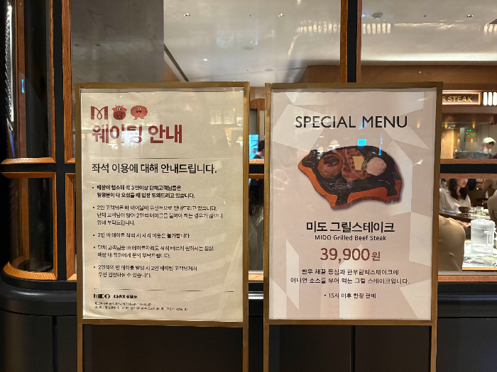 일찍 도착한 덕분에, 하우스오브신세계에서 가장 인기 많은 맛집 중 하나인 미도한우함박에 대기 없이 바로 입장할 수 있었어요. 오픈 시간 직후였는데도 금세 자리가 꽉 차더라고요.