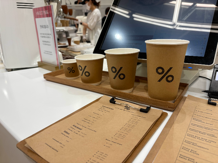 At the counter, their signature % logo cups are neatly displayed by size — simple but visually satisfying.