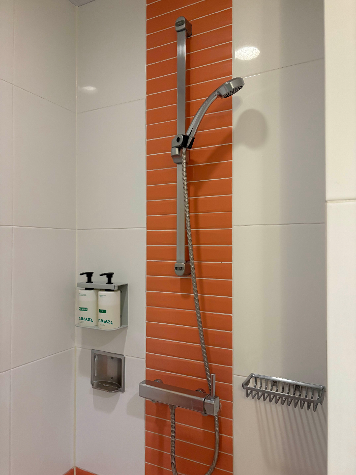 The bathroom was designed with a separate shower booth and toilet. Shampoo and a combined face & body wash were provided in refillable containers.