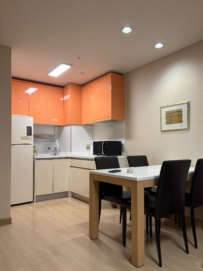 현관 옆에는 주방 공간이 마련되어 있었고, 4인용 식탁이 있어 간단한 식사나 간식 먹기에도 충분했어요.