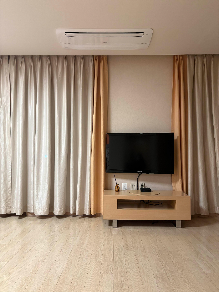 TV는 침대와 소파 사이에 다소 애매하게 설치되어 있었는데요. 각도 조절이 살짝 가능해서 침대에서도, 소파에서도 볼 수 있도록 배치된 것 같았어요.