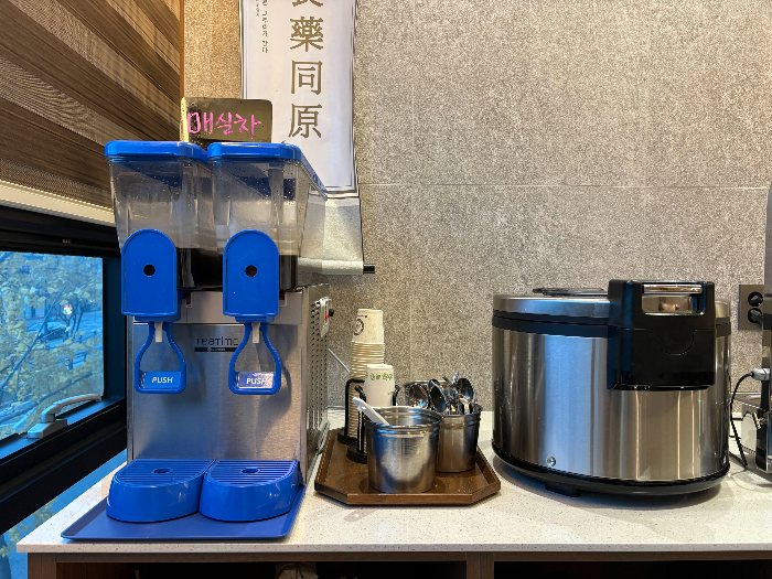 셀프바에는 추가로 먹을 수 있는 밑반찬과 쌈 채소 등이 있었고, 식사 후 입가심으로 마실 수 있는 매실차도 있었어요.