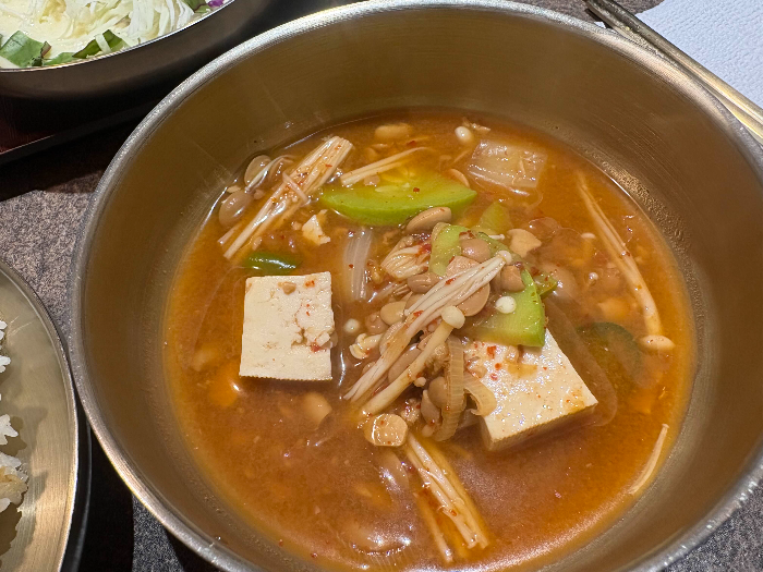 The soybean paste stew was filled with ingredients like mushrooms, tofu, and zucchini, giving it a rich, comforting, and hearty flavor.