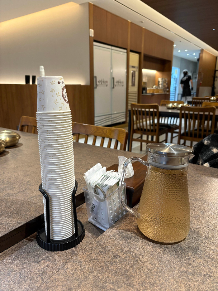 테이블에는 종이컵과 따뜻한 물이 미리 준비되어 있었고, 물티슈와 티슈도 함께 놓여 있었어요.