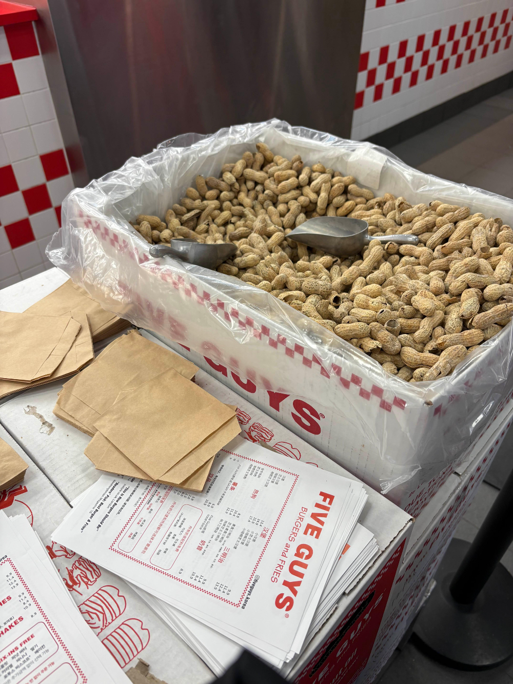 Something I missed in the U.S.—Five Guys offers free peanuts while you wait. You have to crack them open yourself, but they’re nicely roasted and slightly salty, which makes them pretty addictive.
