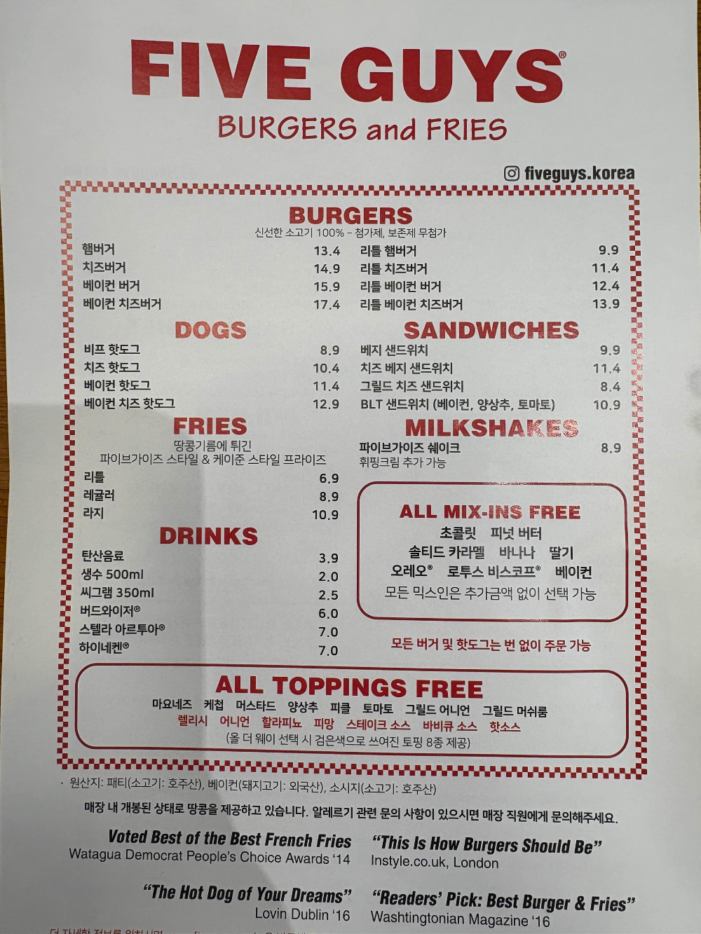 미국에서도 한 번 가본 적이 있지만, 아울렛 내 간이 매장이어서 파이브가이즈의 매력을 온전히 느끼기엔 아쉬움이 있었던 곳이라..