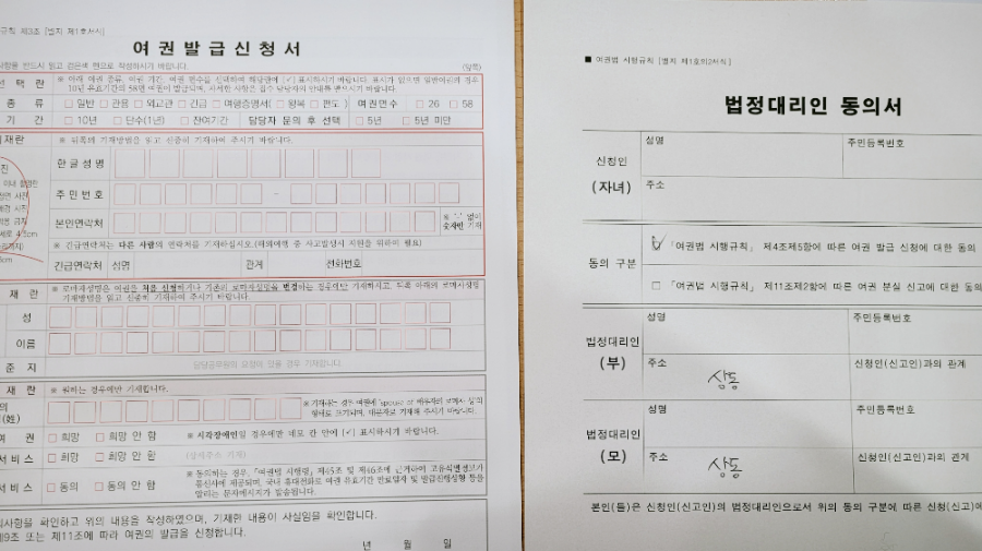 준비물은 기존 여권, 6개월 이내에 촬영한 여권 사진 그리고 발급 수수료를 결제할 수 있는 신용카드나 현금입니다. 아이 여권을 같이 신청하다보니 가족관계증명서 같은 서류가 필요하지 않을까 했는데, 구청 방문해서 작성하는 서류로 정보를 조회하기 때문에 준비물은 생각보다 간소했어요.