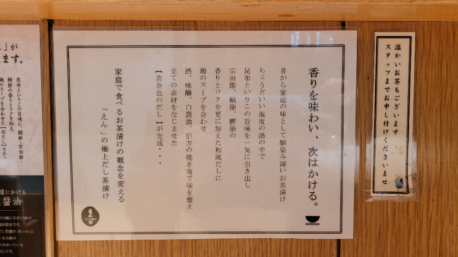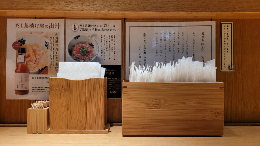 I saw this restaurant on the day I arrived at Narita Airport. At first glance, it looked like a ramen restaurant, but it turned out to be a specialist in dashi chazuke (rice with broth poured over it). It was the perfect choice to have brunch.