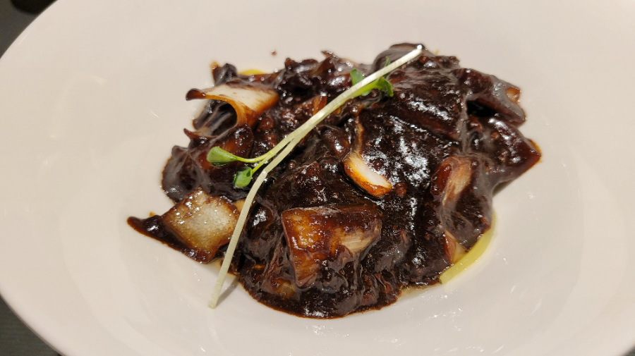 The second dish, Cantonese-style Chao Huang, was a stir-fried dish that included mushrooms, chives, bamboo shoots, beef, and various seafood in a thick starch sauce.