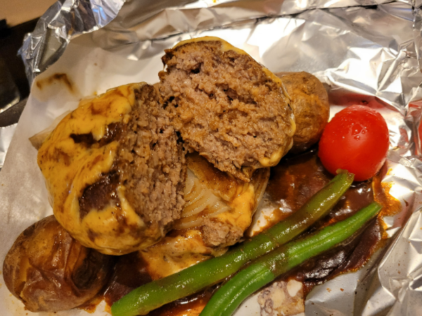 The hamburg steak was thick and juicy. It was served with roasted baby potatoes, green beans, and cherry tomatoes.