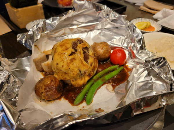 엄청 두툼하고 육즙 가득한 함박이었어요. 알감자, 그린빈, 방울토마토도 같이 구워져 나왔고, 소스에 찍어먹으니 맛있었어요.