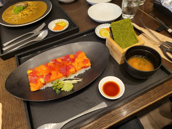 커다란 초밥 같은 느낌인데, 참치와 연어 그리고 아보카도가 밥 위에 올려져 있어요.