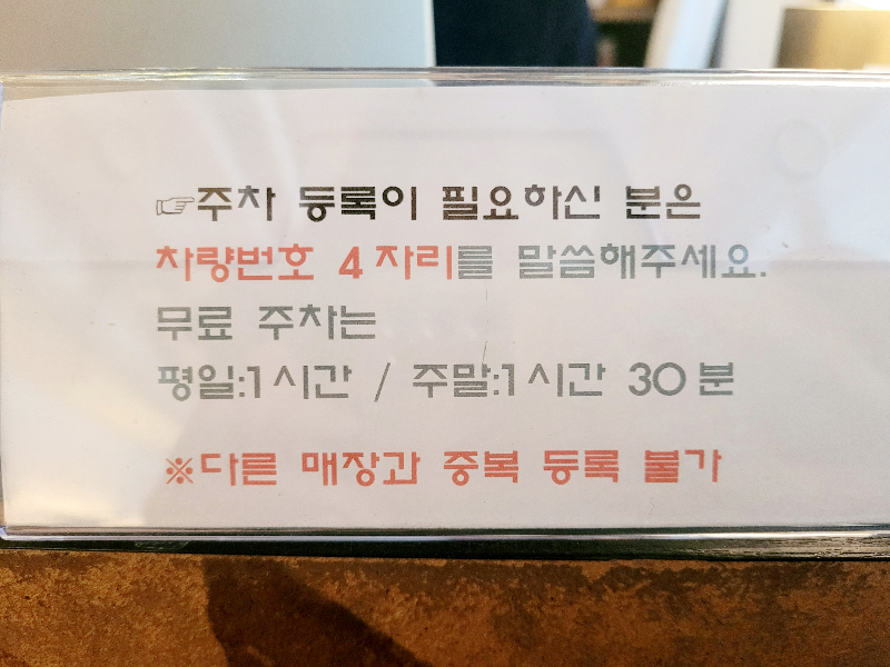 주차도 등록이 가능한데, 시간이 길지 않고 다른 매장과 중복 등록이 불가능해서 여유롭게 식사하려면 추가 요금 내는 게 불가피해요.